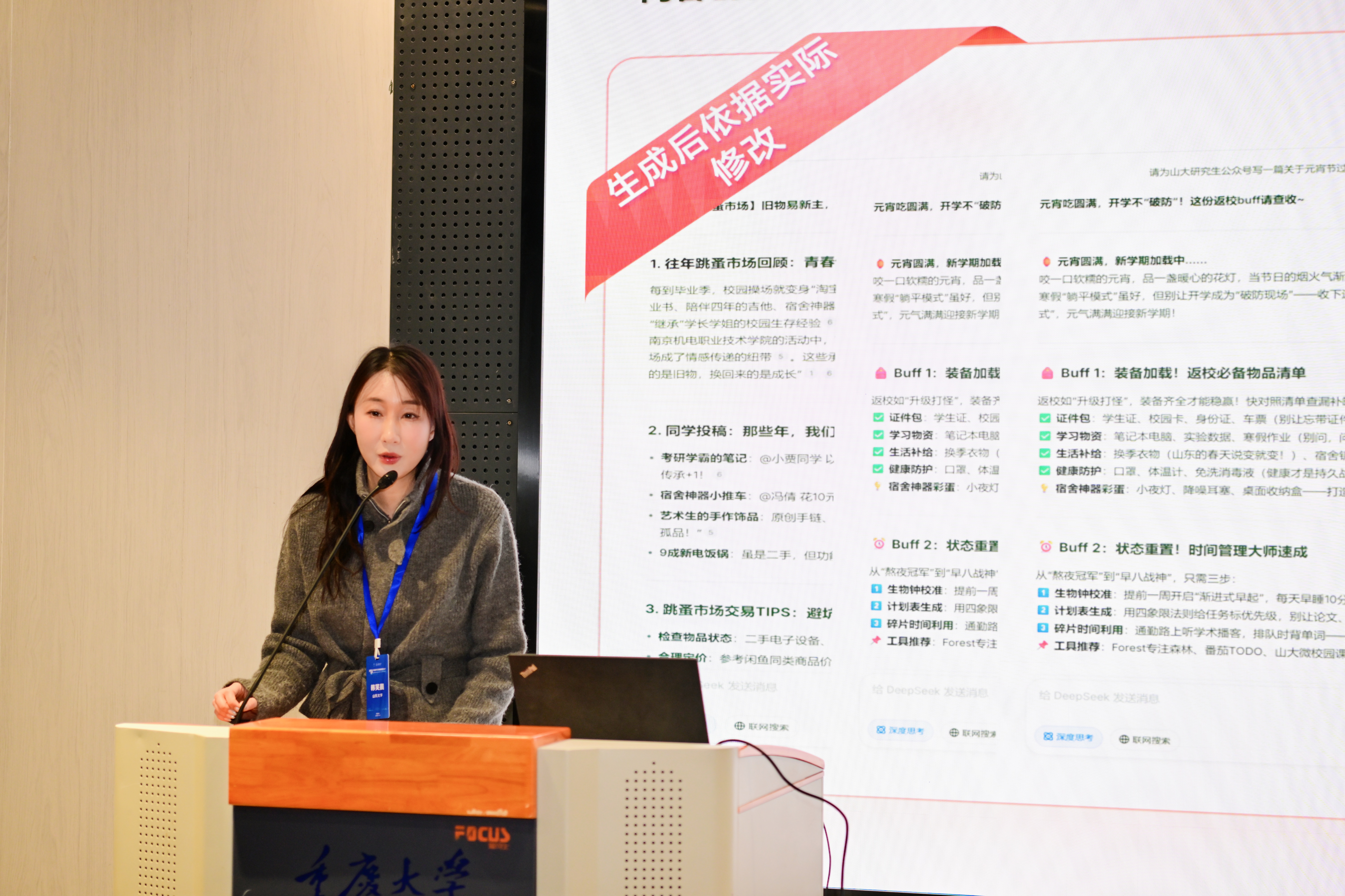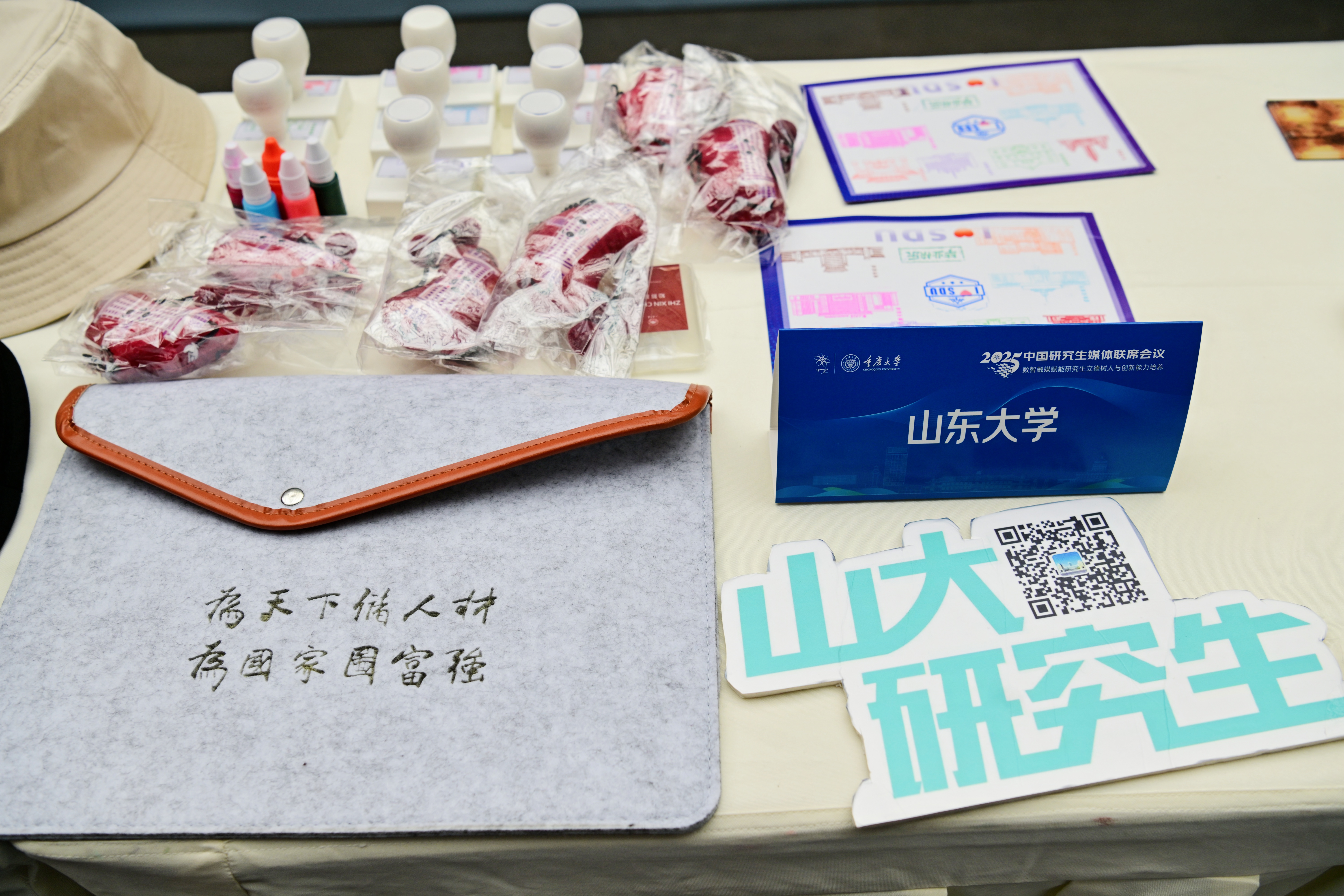 在高校研究生媒体风采与文创作品展示环节中,通过对“山大研究生”微信公众号的基本情况、年度工作亮点与育人成果的全面梳理,系列文创产品如文件夹、印章、明信片、香水、包挂等的现场展示,生动展现了平台建设的特色风采与创新活力。
