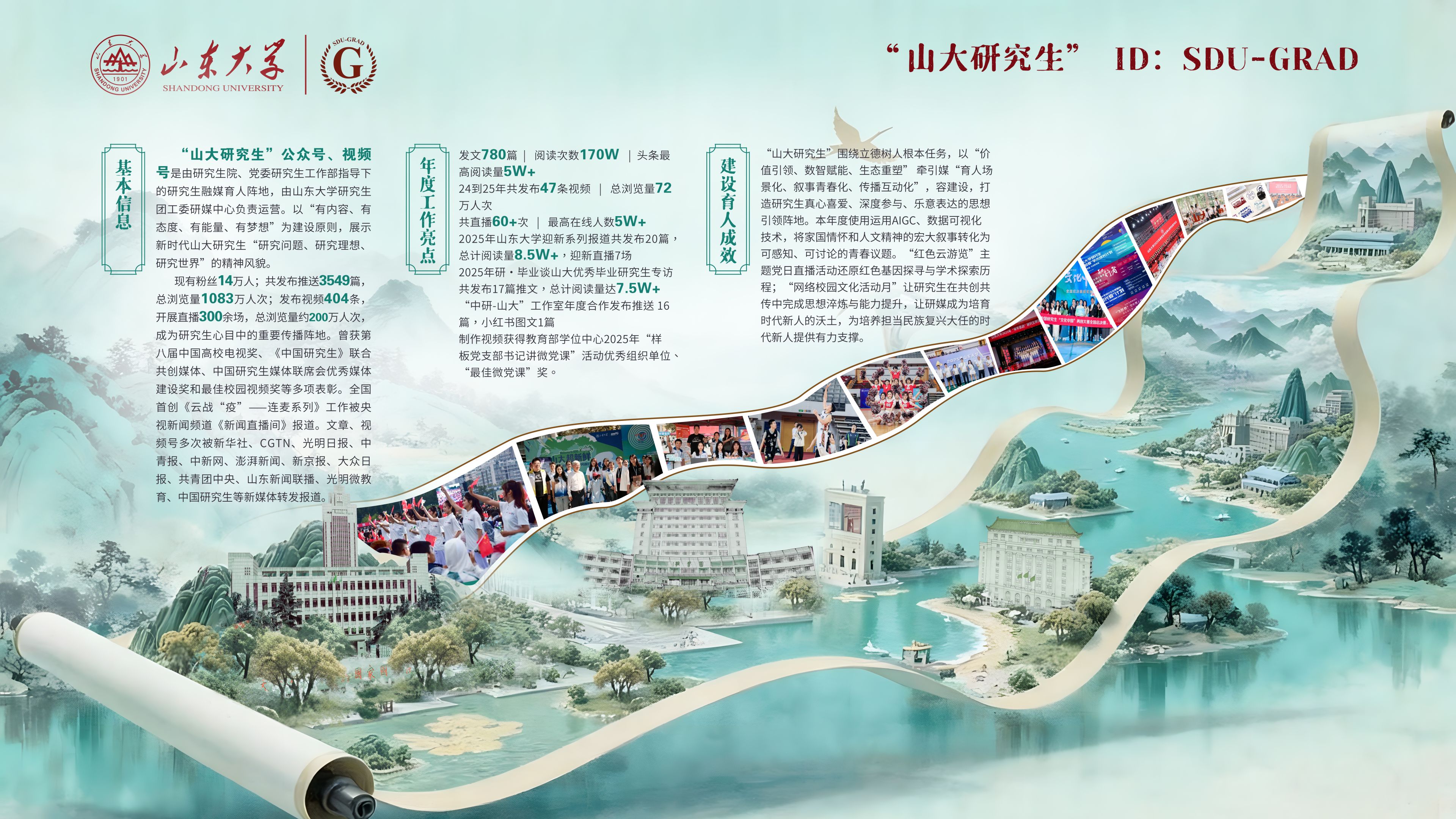 近年来,学校积极顺应数字化与智能化发展趋势,在研究生思想政治教育中深入探索“数智育人”实践路径,以“山大研究生”融媒体平台为核心载体,共计发布3000多篇推文,400余条视频,累计粉丝逾十四万人,总浏览量破千万,2025年度共计发布推文800余篇,浏览量170余万次,单篇最高浏览量5万余次,被央视新闻直播间、中青报等报道。通过构建智能传播矩阵、打造沉浸式数智育人场景,精准把握研究生思想动态与成长需求,着力推动新时代高等教育数字化转型与思想政治教育创新发展。
