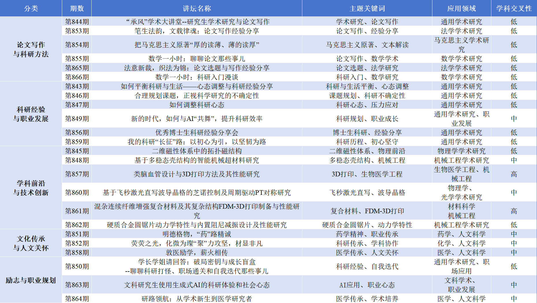 在科研能力提升维度,聚焦“选题—写作—投稿—发表”这一流程主题。针对论文写作与科研方法,举办论文主题交流及工具化指南论坛,如法学院华蕴志在第853期对人文社科论文写作经验作分享;数学学院王鑫、王镜涵、赵荣在第855期“聊聊论文那些事儿”,帮助研究生提升学术表达力。针对“心态调整—课题规划—效率提升”实战需求,举办了科研节奏适配、AI高效应用、优秀博士生经验分享等论坛,如生命科学学院尹美淇在第843期作“如何平衡科研与生活——心态调整与科研经验分享”;哲学与社会发展学院刘姝杉在第856期分享文科研究生使用生成式AI的科研体验和社会心态;生命科学学院王硕在第849期分享“新的时代,如何与‘AI共舞’,提升科研效率”,强调要夯实学术执行能力。