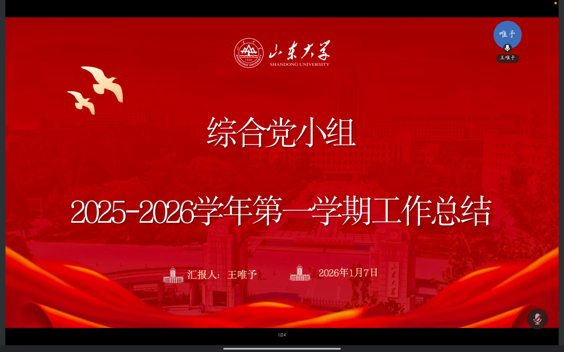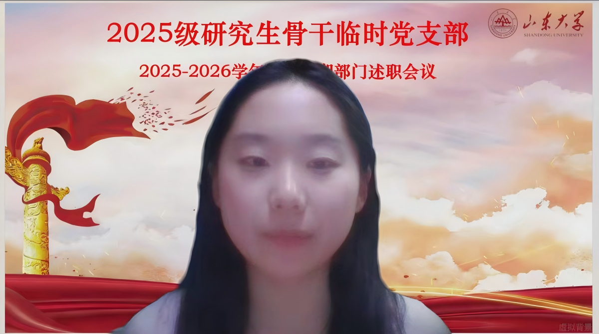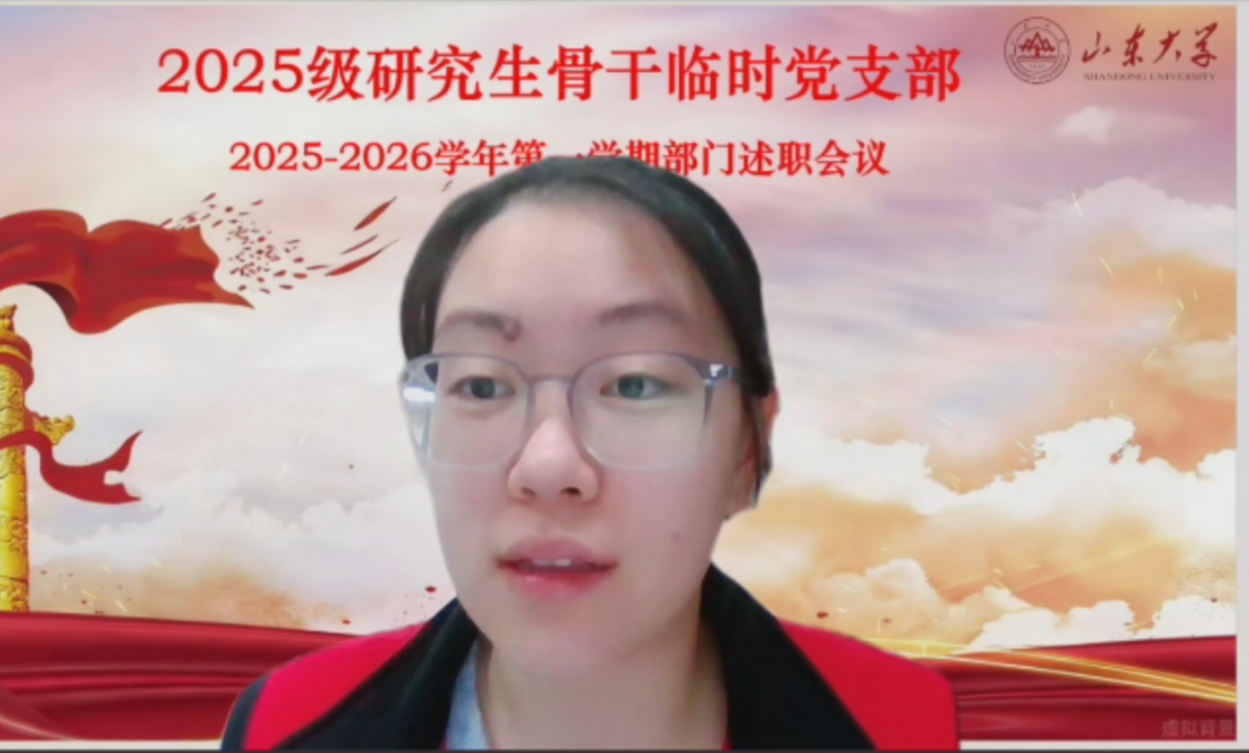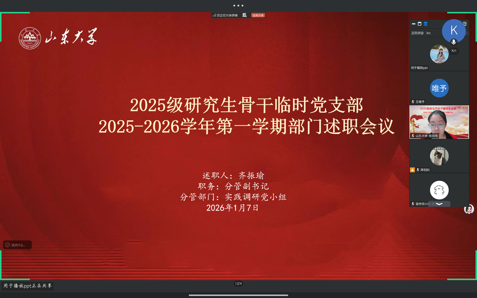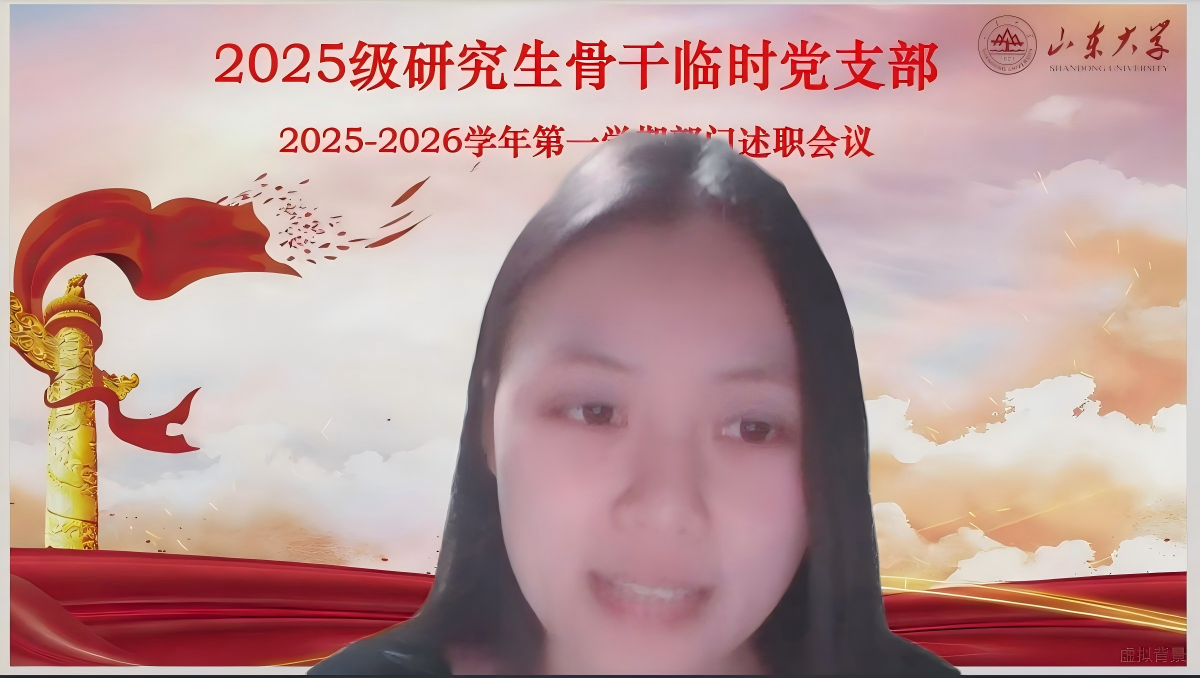 近日,2025 级研究生骨干临时党支部线上召开 2025-2026 学年第一学期述职会议。会议由2025级研究生骨干临时党支部书记张玲雨主持,一校三地党支部全体成员参会,旨在全面总结学期工作、查摆问题不足,进一步凝聚党建工作合力。