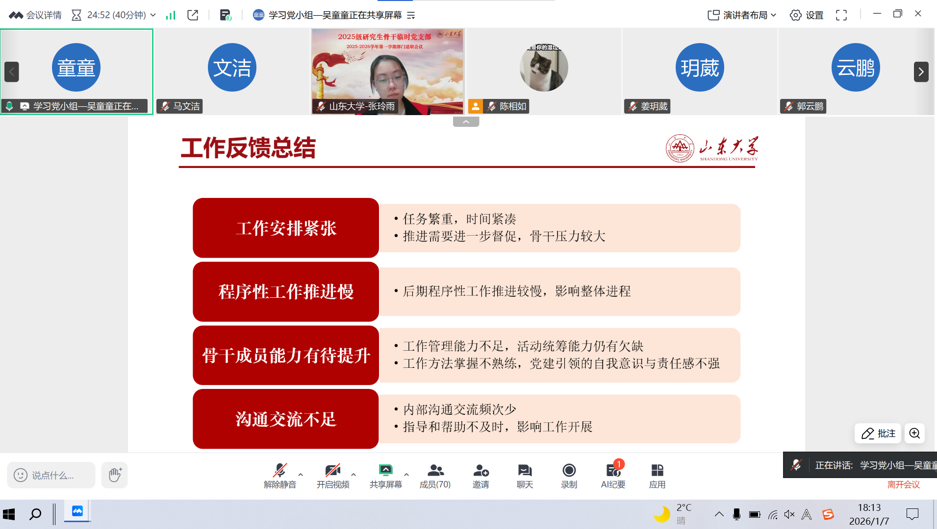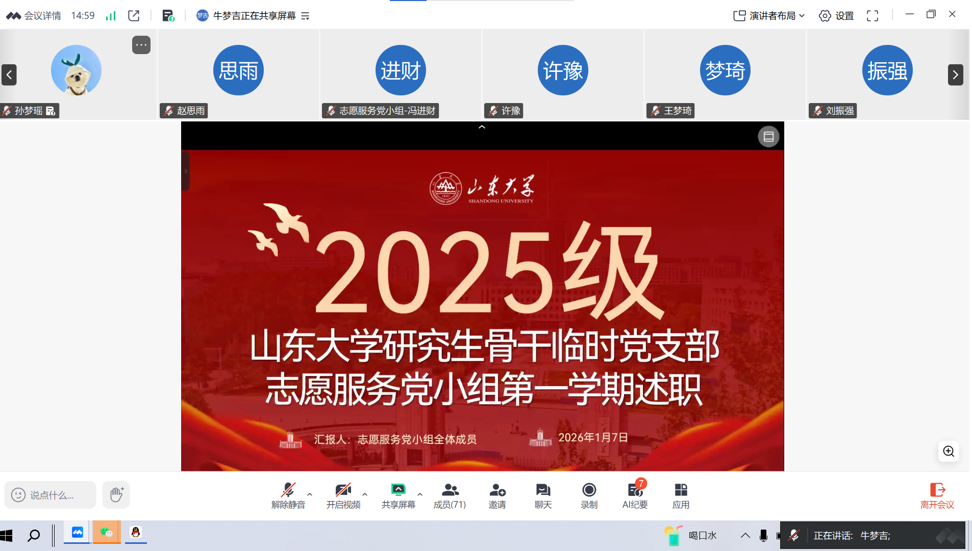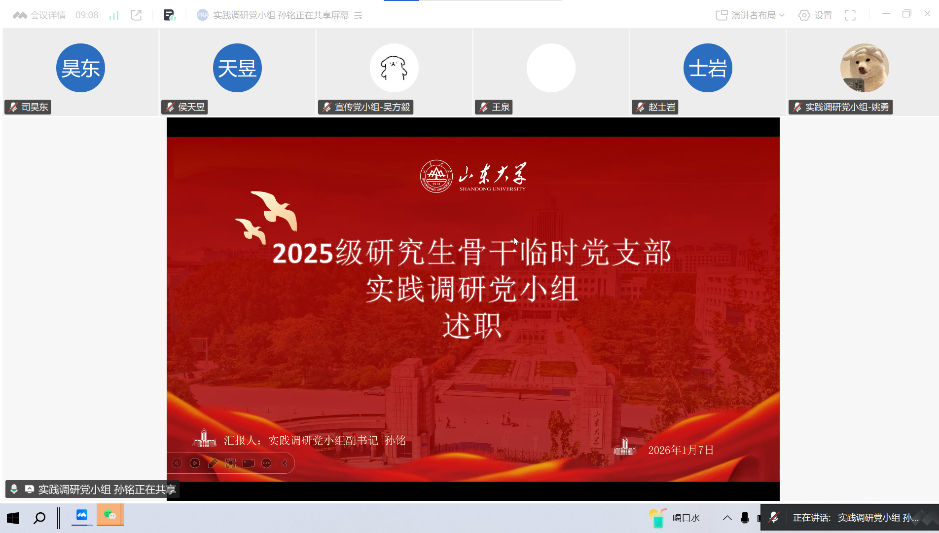 近日,2025 级研究生骨干临时党支部线上召开 2025-2026 学年第一学期述职会议。会议由2025级研究生骨干临时党支部书记张玲雨主持,一校三地党支部全体成员参会,旨在全面总结学期工作、查摆问题不足,进一步凝聚党建工作合力。
