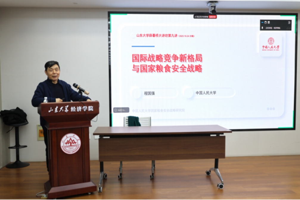 10月24日,经济学院“薛暮桥大讲坛”于中心校区知新楼B423举行,中国人民大学吴玉章讲席教授程国强受邀作题为“国际战略竞争新格局与国家粮食安全战略”的学术报告。讲座由经济学院常务副院长石绍宾主持。