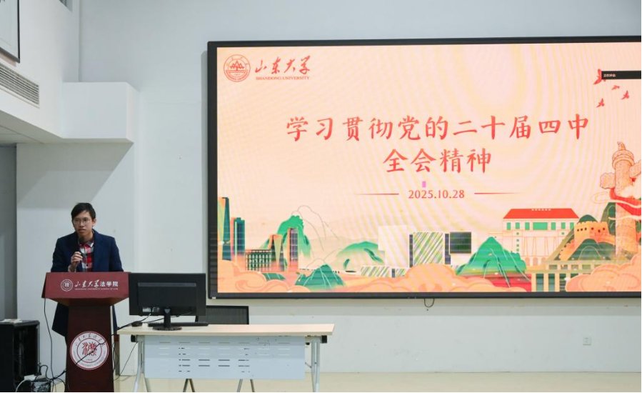 首先,法律硕士(法学)第一党支部书记关申迪领学《山东大学深入学习贯彻党的二十届四中全会精神学习材料》。关申迪围绕全会概况、主要议程与成果展开解读,重点阐述了“十四五”时期我国在经济实力、科技实力、综合国力等方面取得的重大成就,详细解读了“十五五”时期的历史方位、指导思想、六大原则及经济社会发展目标。