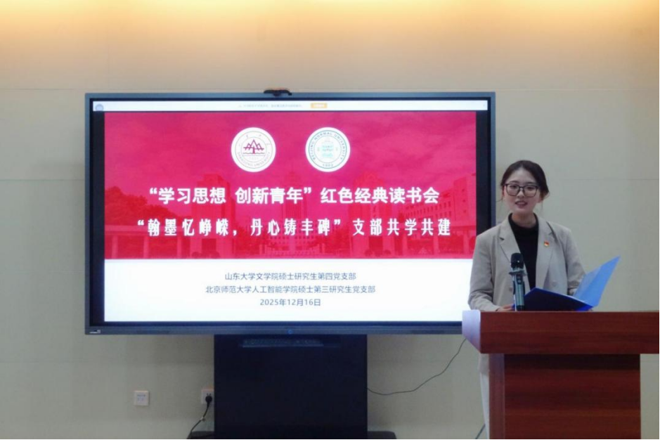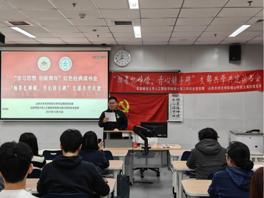 为纪念中国人民抗日战争暨世界反法西斯战争胜利80周年,深入推动党史学习教育常态化开展,12月16日晚,山东大学文学院硕士研究生第四党支部与北京师范大学人工智能学院硕士第三研究生党支部以“翰墨忆峥嵘,丹心铸丰碑”为主题联合举办红色经典读书会。本次读书会在山东大学知新楼A606、北京师范大学昌平校园二号教学楼312开展,采取线上联线与线下学习结合的方式联学共建。读书会由文学院硕士研究生第四党支部书记时亦文、北京师范大学人工智能学院硕士第三研究生党支部书记蒋金鹏共同主持,两支部60余人到场参会。