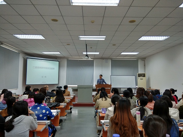 在讲座正式开始之前,卢敏对任伟教授的到来表示热烈的欢迎,并简单介绍了此次讲座的内容。讲座伊始,任伟首先向大家介绍了语用学的整体概念、不同学者对语用能力的不同理解,并对语言语用学和社会语用学的区别进行了解释。接着,任伟介绍了自己的主要研究方向——二语语用学及其发展,从而引出了交叉研究的方法,比如语用学和二语研究、二语教学、二语测试的结合等。他还针对二语习得的研究现状,指出研究学生语用产出的发展应该做历时性研究。随后,任伟围绕留学情景下的语用发展就某些学者的研究发现做了相应分析,并结合自己的学术研究经历,阐述了其研究方法的选择,他认为应当采取录音而非问卷的调查方式。最后,任伟就二语语用研究领域的未来发展趋势给出了自己的一些见解,如相同学生不同语用能力的发展、学生所不具备的语用能力、教学干预对语用能力发展的影响等。