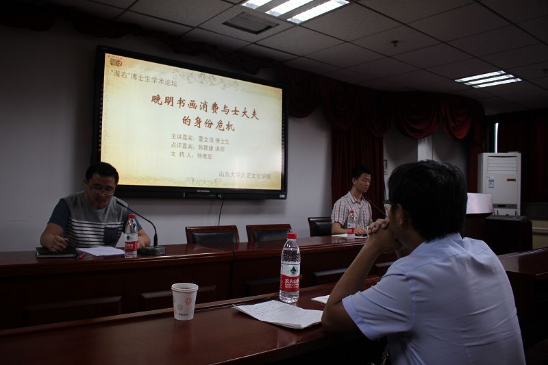 5月16日晚,由山东大学研究生院、党委研究生工作部主办,历史文化学院承办的第16期(总580期)“海右”博士生学术论坛在中心校区知新楼A座1106顺利举行。此次论坛是“海右”优秀博士生报告月系列活动之一,邀请了2013级中国史博士研究生董文强作题为“晚明书画消费与士大夫的身份危机”的学术报告。报告由历史文化学院韩朝建老师担任点评嘉宾,2015级中国史硕士研究生他维宏担任主持人。 报告开始,董文强博士首先阐述了晚明社会士大夫和大众阶层的书画消费情况。他强调士大夫书画消费具有天然的文化意味,即“士君子读书出身,虽位至卿相,当存一分秀才气,方是名士。”士大夫阶层既包括高官贵胄,也涵盖普通的士大夫群体,其书画消费空间分布于集市、书画船、书斋等,其目的主要作社交、展示夸耀之用。而大众阶层在书画消费上以仿效士大夫阶层的做法为主,商人群体认为“雅俗之分,在于古玩之有无,故不惜重值,争而收入”,太监群体则“大率欲招致朝绅之好事者往来,壮观门户”。