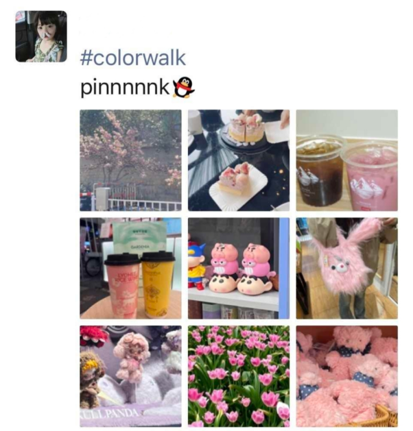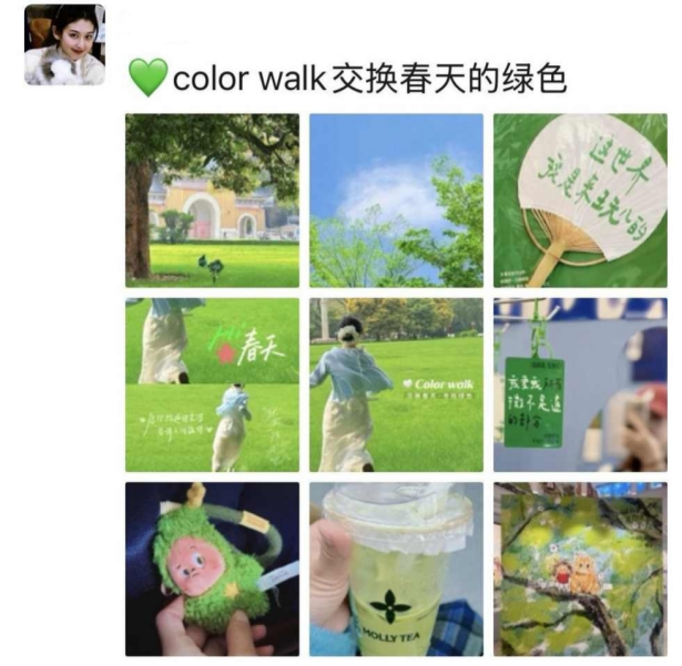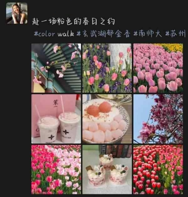 活动自发布以来,同学们积极响应,纷纷走出教室、实验室与图书馆,用镜头捕捉春日色彩,并通过朋友圈分享了大量充满创意与温情的九宫格截图。这些作品涵盖粉、白、绿、黄、蓝、红等多种色调,每一种颜色都成为一段独特的春日叙事。