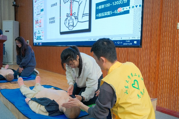 为筑牢校园安全防线,提升非医学专业学生的应急救护能力,2025年11月28日,由山东大学化学与化工学院主办的“校园安全守护计划”主题活动在化学老楼学术报告厅举办。本次讲座特邀山东大学第二临床学院师生团队介绍心肺复苏(CPR)与海姆立克急救法等核心救助技能,学院教师及百余名研究生参与活动。
