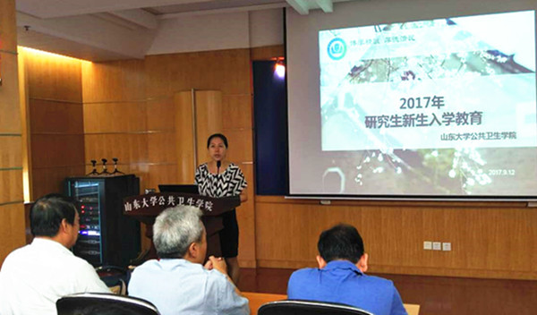 李士雪首先代表学院领导班子对2017级全体研究生新生入学表示热烈欢迎及祝贺,并勉励大家规划好未来三年的学习生活,明确学习动机,通过实现山大梦,进一步实现个人的人生梦、民族梦。之后,李士雪围绕校史院史介绍、专业特色、公共卫生与健康中国等主题为同学们带来全面细致的指导。随后,他以“公共卫生与健康中国”为主题,为2017级新生上了生动的开学第一课。他讲到,公共卫生的宗旨是保障和促进公众的健康,向同学们提出要为社会提供全人群、全方位、全周期的“三全”服务的要求,对公共卫生与预防医学的定义做出了精准的解释说明,对现行的公共卫生体系以及预防医学与公共卫生的关系进行了说明讲解,向同学们介绍了当前公共卫生所面临的十大机遇和挑战,结合院训“博学精诚,厚德济民”,给全体新生提出了希望和要求。