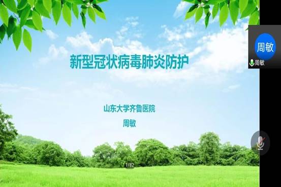 周敏老师向同学们细致科学地讲解了新冠肺炎防护常识,她首先给大家讲解了新型冠状病毒肺炎的潜伏期、症状、治疗以及预后等内容,并且向同学们介绍了对于新冠肺炎的预防和防护知识,包括口罩种类、佩戴方法和使用场景,手卫生、消毒与咳嗽的方法,乘坐电梯、居家隔离、出行、收取快递、热水澡、办公学习、购物与就餐、就医等各种场景下的注意事项。周敏老师讲到,每个人做好专业的防护,不仅是对自己负责,也是对他人负责,希望大家能够保护自己保护他人。