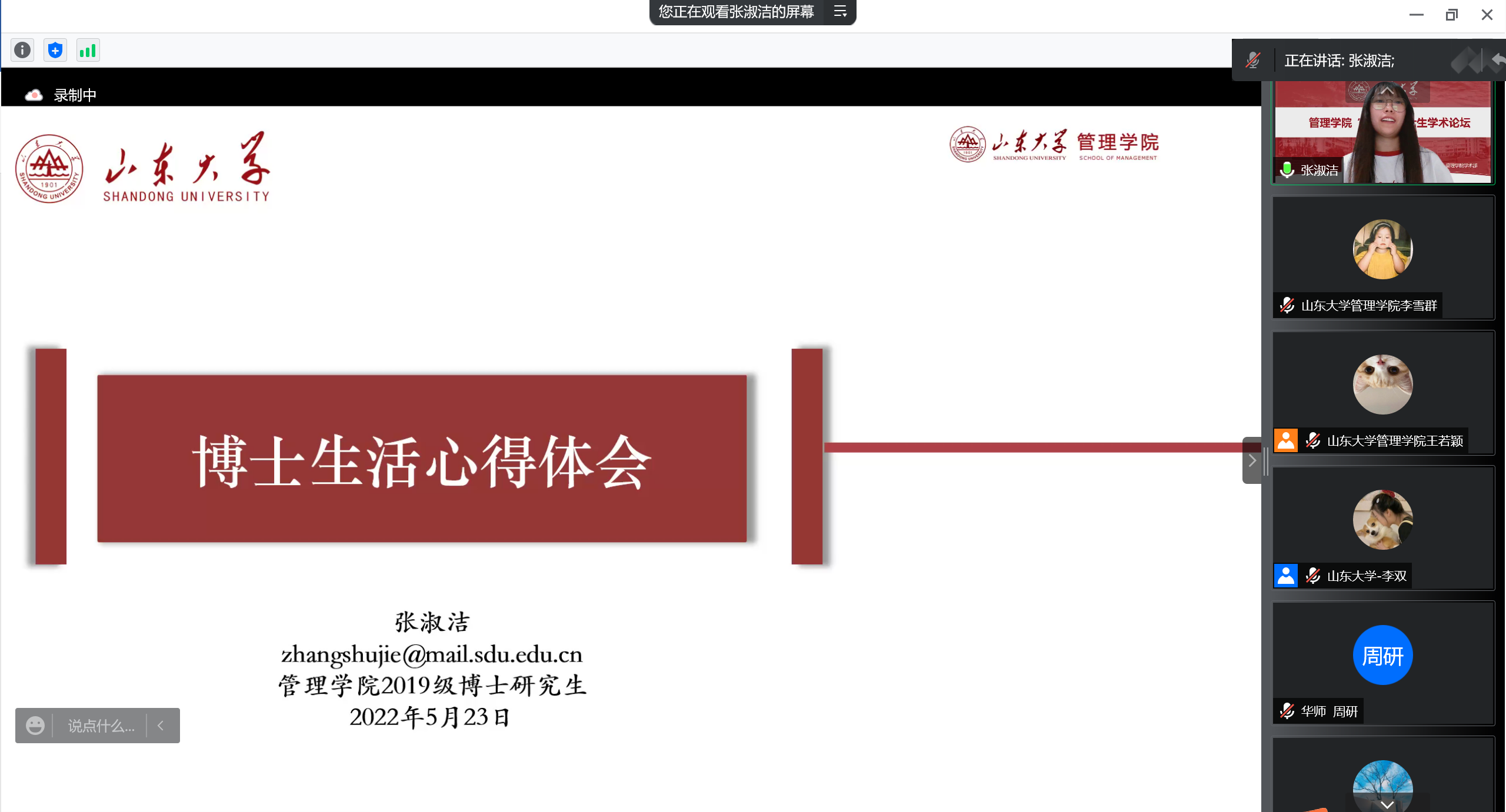 2022年5月23日下午15点,由山东大学研究生院、党委研究生工作部主办主办的研究生特色学术活动品牌,管理学院承办的第10期(总773期)“海右”博士生学术论坛如期举办。本次论坛以线上会议形式开展,共有200余名校内外师生出席会议。论坛邀请了邢超、凌润泽和张淑洁三位博士生作报告,并特邀山东大学管理学院会计学专业博士生导师张玉明教授作为点评嘉宾,管理学院研究生辅导员刘蓓蓓老师也受邀出席本次论坛。