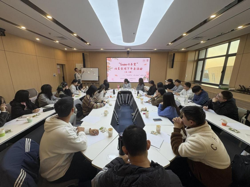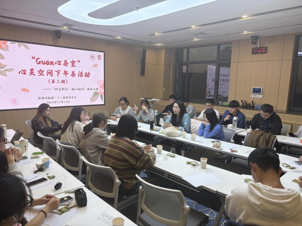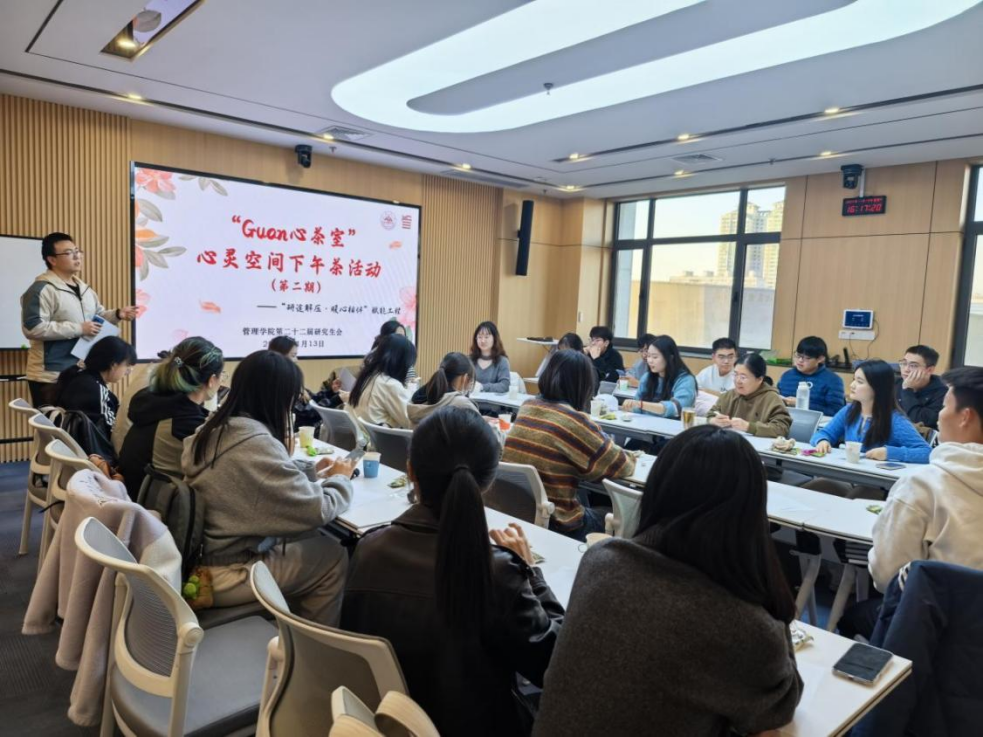 为守护学生心理健康,精准对接学生群体的成长需求,构建积极向上的成长环境,11月13日,管理学院于中心校区组织开展第二期“Guan心茶室”——研究生心灵空间下午茶之会计专硕专场活动。管理学院研究生会指导老师王栋华出席活动,2024级会计专硕优秀研究生代表宋春雨、陈言童应邀作为分享嘉宾,研究生会生活权益部部长李德华主持活动,二十余名会计专硕研究生参与活动。