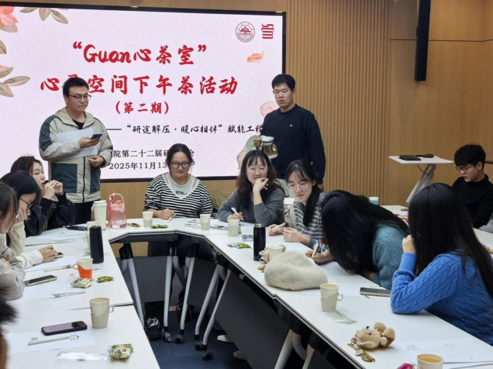 活动设置“暖心开场”“面具解码”“协作闯关”和“心灵对话”四个环节。“暖心开场”环节中,王栋华聚焦研究生成长中经常遇到的“学业压力与职业规划并行”话题,强调了“主动调适心灵、构建同伴支持”的重要性。她表示,“Guan心茶室”是为了帮助大家卸下包袱、轻装前行而打造的温暖空间,鼓励同学们敞开心扉、积极交流,在分享中收获真挚友谊与宝贵启发。