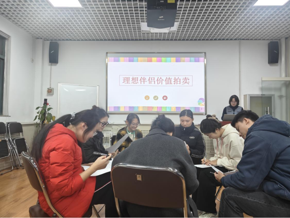 “理想伴侣价值拍卖”环节采用模拟竞拍的形式,从内在素养和外在条件两个维度引导参与者对理想伴侣具备的特质进行排序和竞价。各组同学通过充分讨论与审慎抉择,不断厘清自己在亲密关系中的价值取向。这一过程不仅让参与者更好地理解了自身的情感需求,更让他们深刻认识到经营一段健康恋爱关系所需具备的关键要素。