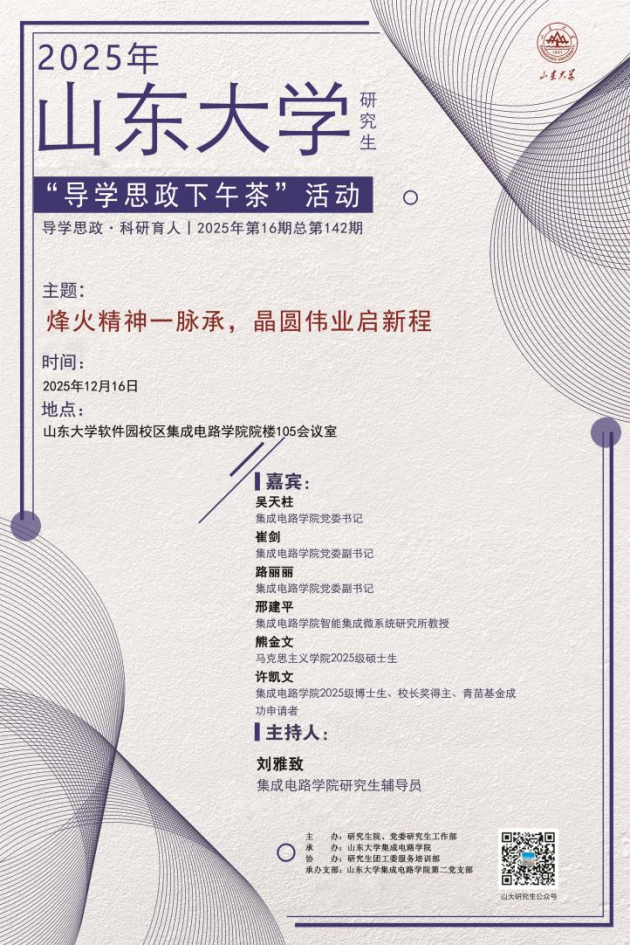 时值中国人民抗日战争暨世界反法西斯战争胜利80周年,为深入落实立德树人根本任务,将红色基因融入科研实践,2025年12月16日下午,集成电路学院举办“烽火精神一脉承,晶圆伟业启新程——‘回望峥嵘岁月·共铸中国芯魂’导学思政下午茶”活动。