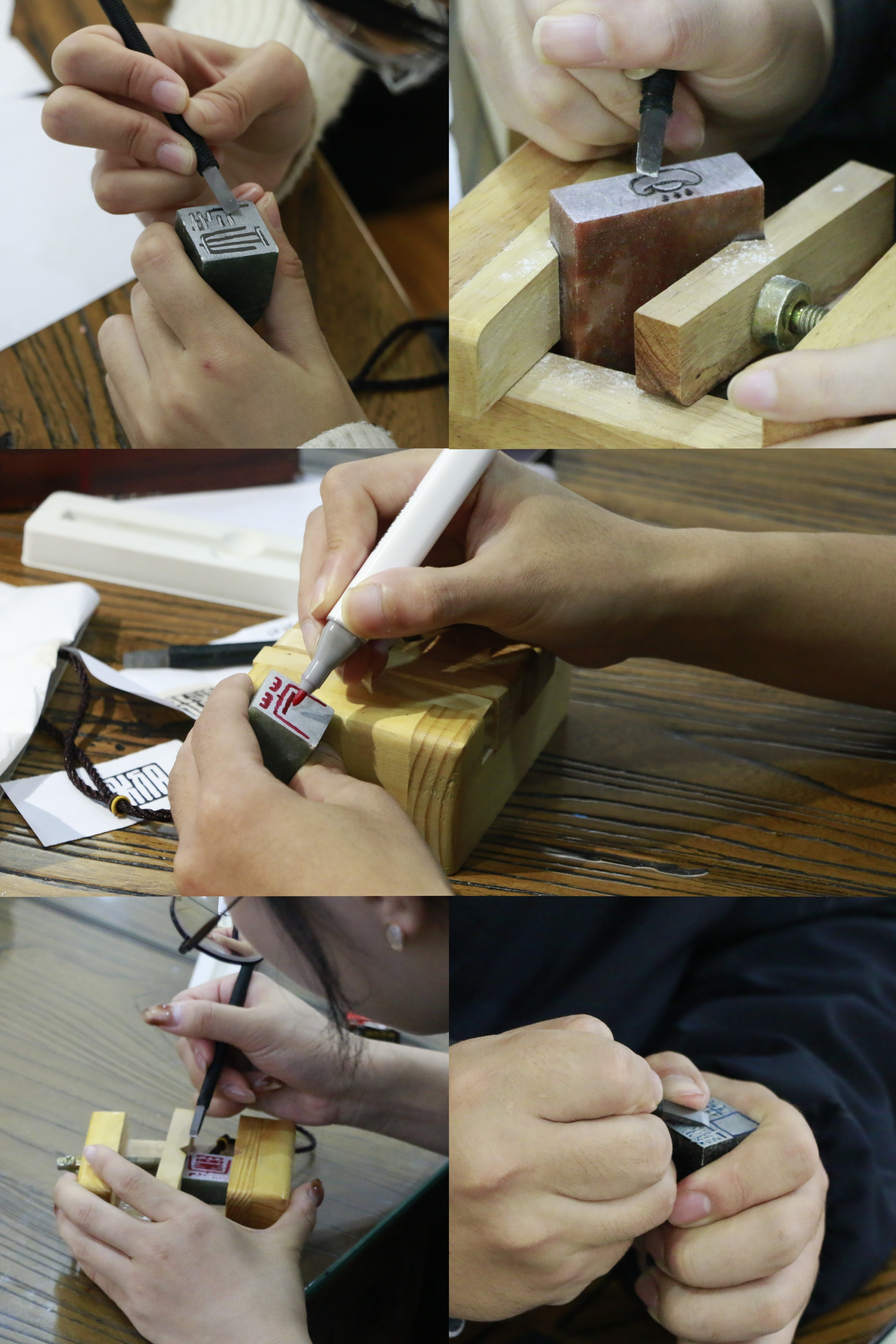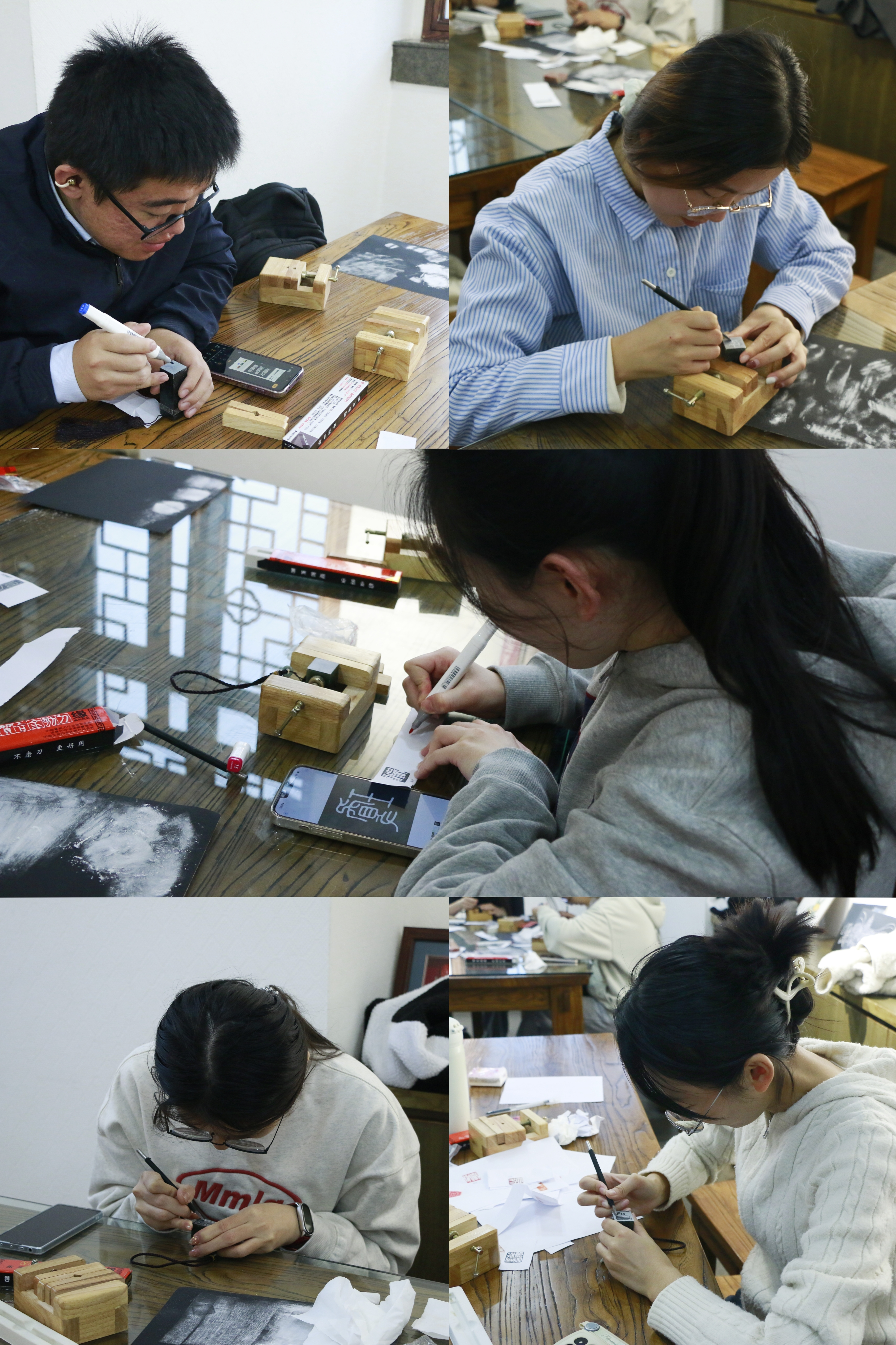 “刻印留冬——创意篆刻设计”环节,同学们在老师的指导和帮助下,设计并尝试亲手篆刻印章,活动现场气氛热烈,金石交错之声不绝于耳。同学们在集章册上郑重盖下亲手设计的印章,将这份独特的立冬记忆永久珍藏。