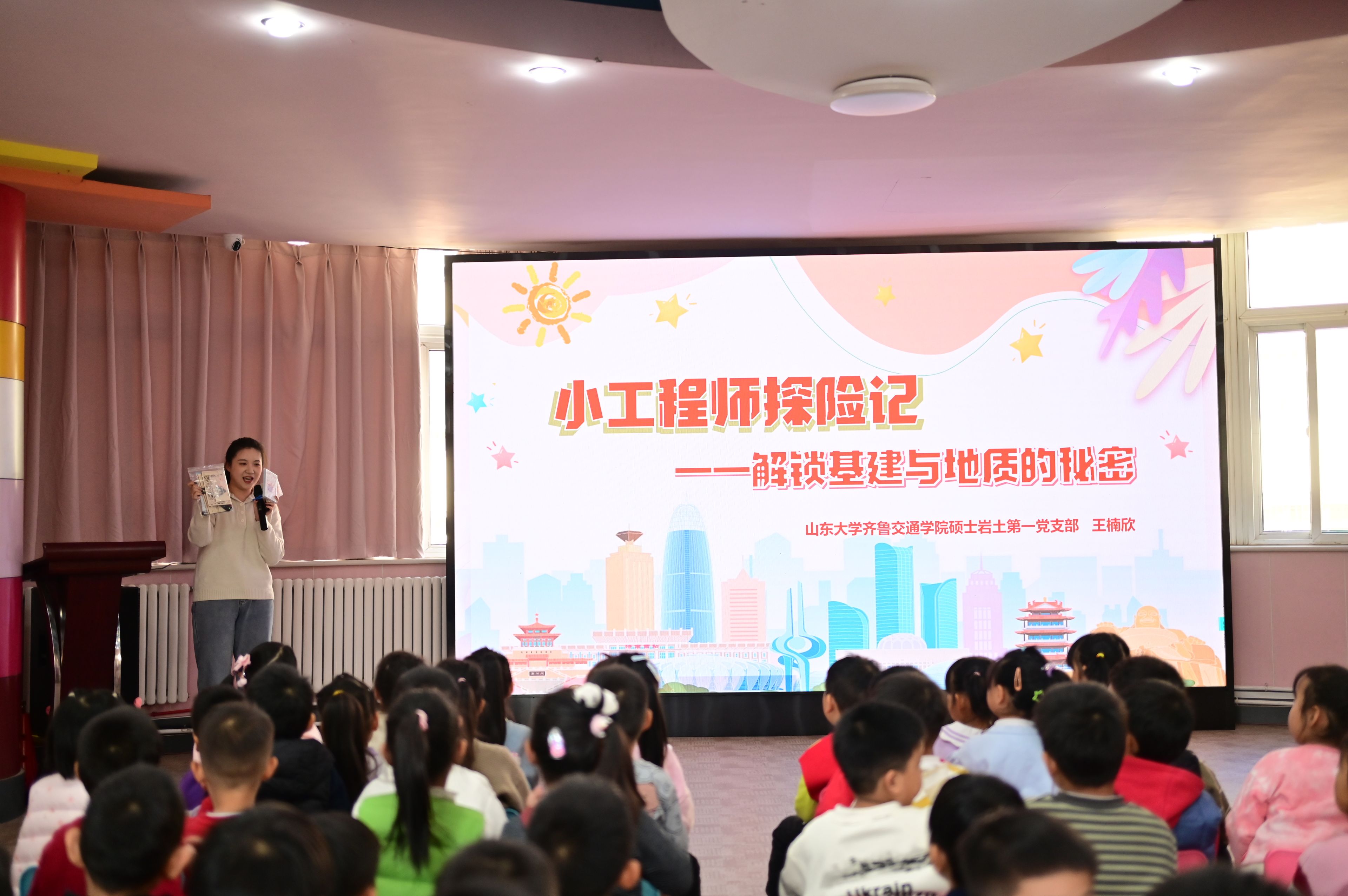 11月21日,山东大学齐鲁交通学院硕士岩土第一党支部组织“红岩知行团·科普进校园”活动,走进山东银座英才幼儿园百花园大班,以《小工程师探险记》为主题为小朋友们带来了一堂生动有趣的科普课。本次活动由硕士岩土第一党支部副书记王楠欣担任主讲,旨在发挥高校党建与专业优势,推动科普资源下沉基层、服务少年儿童成长。