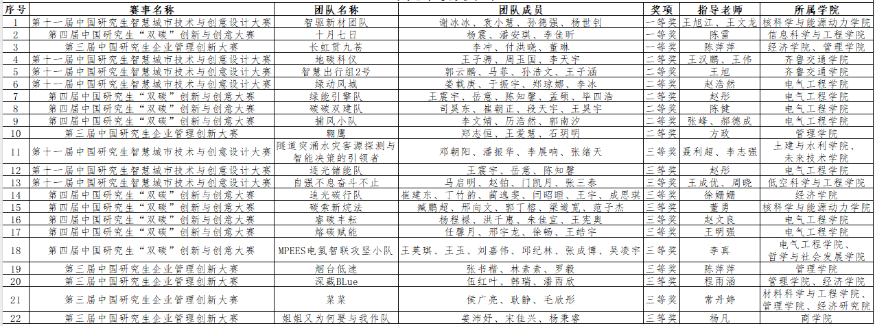 在本月举办的第十一届中国研究生智慧城市技术与创意设计大赛、第四届中国研究生“双碳”创新与创意大赛、第三届中国研究生企业管理创新大赛三项赛事中,山大研究生再获佳绩,取得一等奖3项、二等奖7项、三等奖12项。核科学与能源动力学院王旭江、王文龙,信息科学与工程学院陈雷3位教师获优秀指导教师。学校获得优秀组织奖2项。