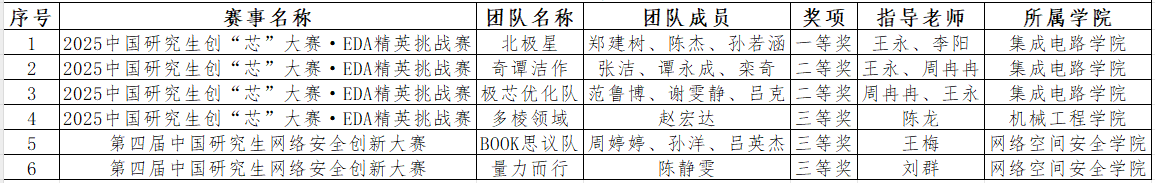 在刚刚举办的2025中国研究生创“芯”大赛·EDA精英挑战赛、第四届中国研究生网络安全创新大赛两项赛事中,山大研究生再获佳绩,取得一等奖1项、二等奖2项、三等奖3项。集成电路学院王永、李阳两位教师获优秀指导老师奖,王永同时获精心育人奖,学校获得优秀组织奖2项。