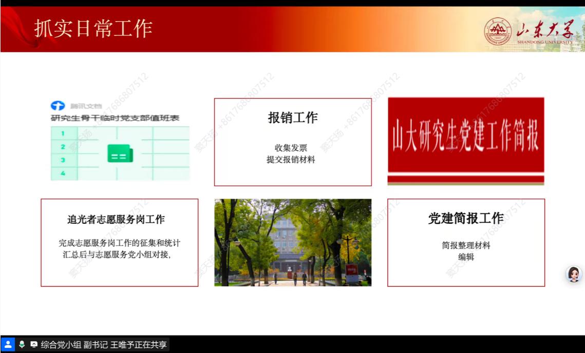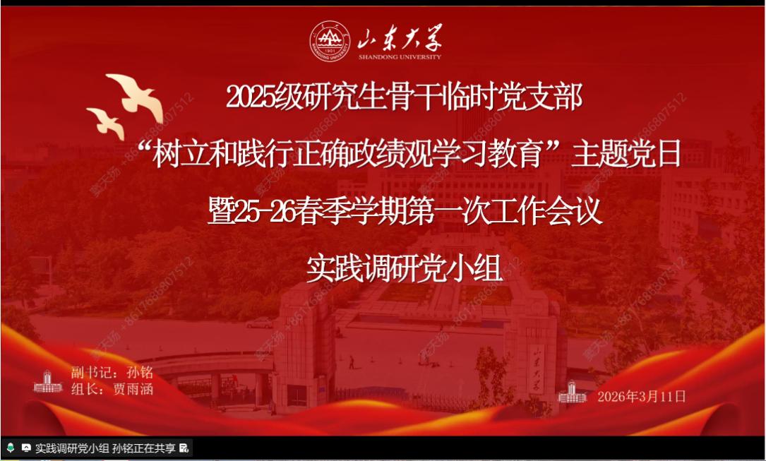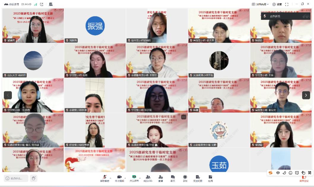 为深入贯彻落实全党树立和践行正确政绩观学习教育工作要求,同时总结复盘工作、明确新学期发展方向,3月11日,2025级研究生骨干临时党支部召开“树立和践行正确政绩观学习教育”主题党日暨2026年春季学期第一次工作会议。党支部书记张玲雨主持会议,党委研究生工作部团工委书记、党支部指导老师韩笑晨出席会议,一校三地73名支部成员参会。