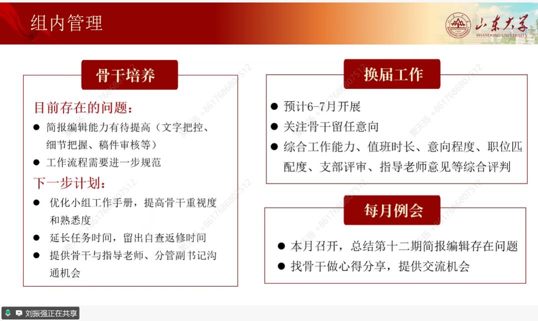 会议首先由分管副书记部署本学期的主要工作。姜玥葳、刘振强结合春季学期工作重点,针对各自分管的党小组提出了在组织协调、志愿服务、理论学习、宣传阵地建设等方面的安排。