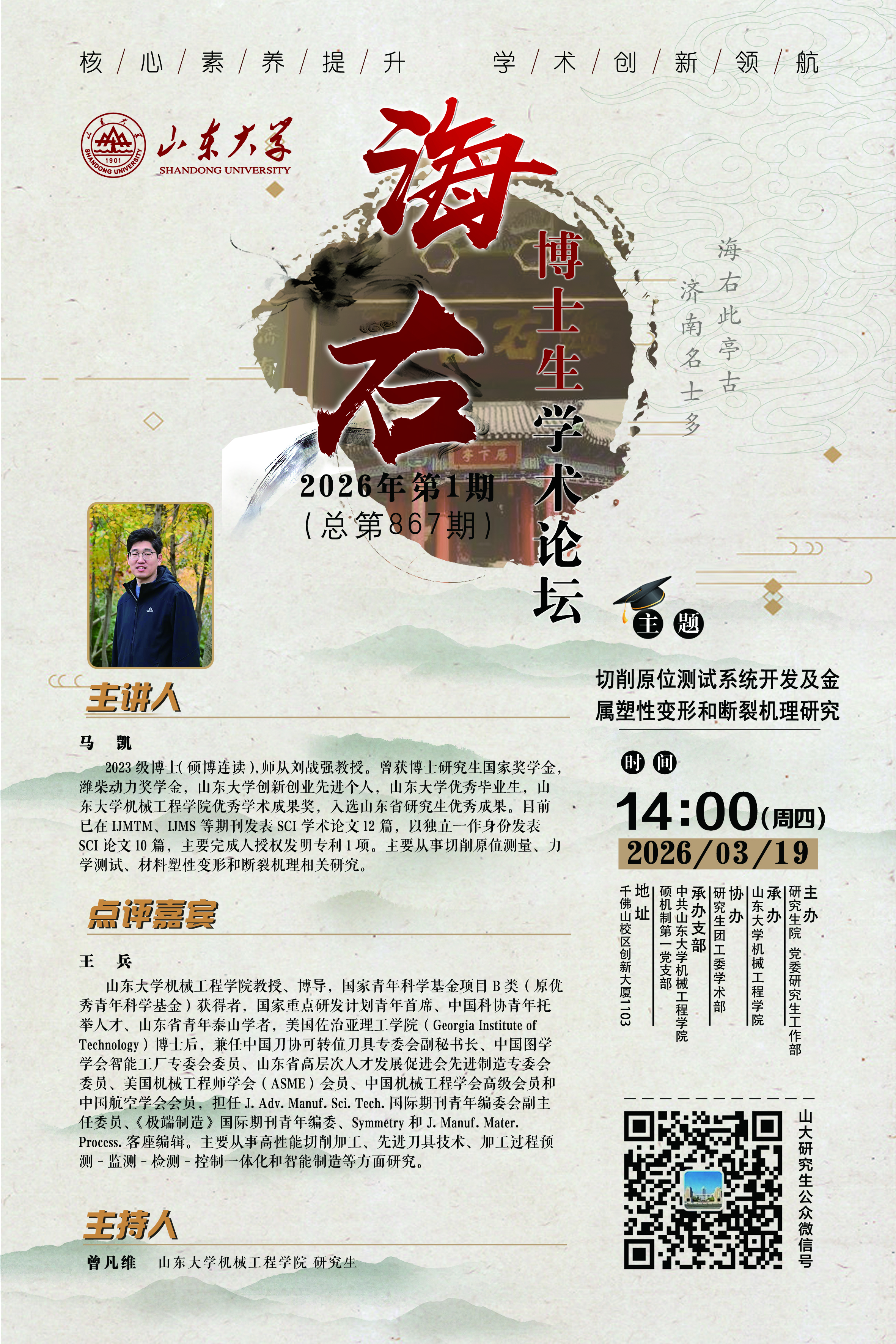 “海右”第867期:切削原位测试系统开发及金属塑性变形和断裂机理研究