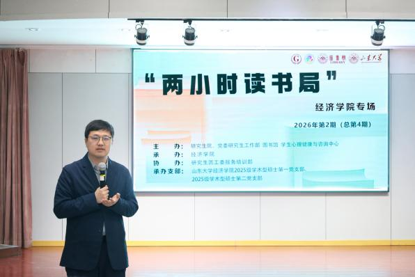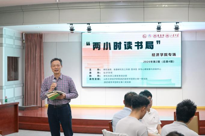 近日,2026年第2期(总第4期)“知行者”研究生核心素养提升训练营——“两小时读书局”经济学院专场在图书馆报告厅顺利举行。本次活动由山东大学研究生院、党委研究生工作部、图书馆、学生心理健康咨询中心主办,经济学院2025级学术型硕士第一、第二党支部共同承办。千佛山校区图书馆馆长潘星舟、学生心理健康咨询中心董晓笑老师担任领读人,图书馆馆长助理宋西贵主持活动。经济学院党委副书记李良杰、南京大学信息管理学院徐雁教授受邀出席并作指导点评,学院研究生党员积极参与,在书香与对话中开启了一场心灵疗愈之旅。