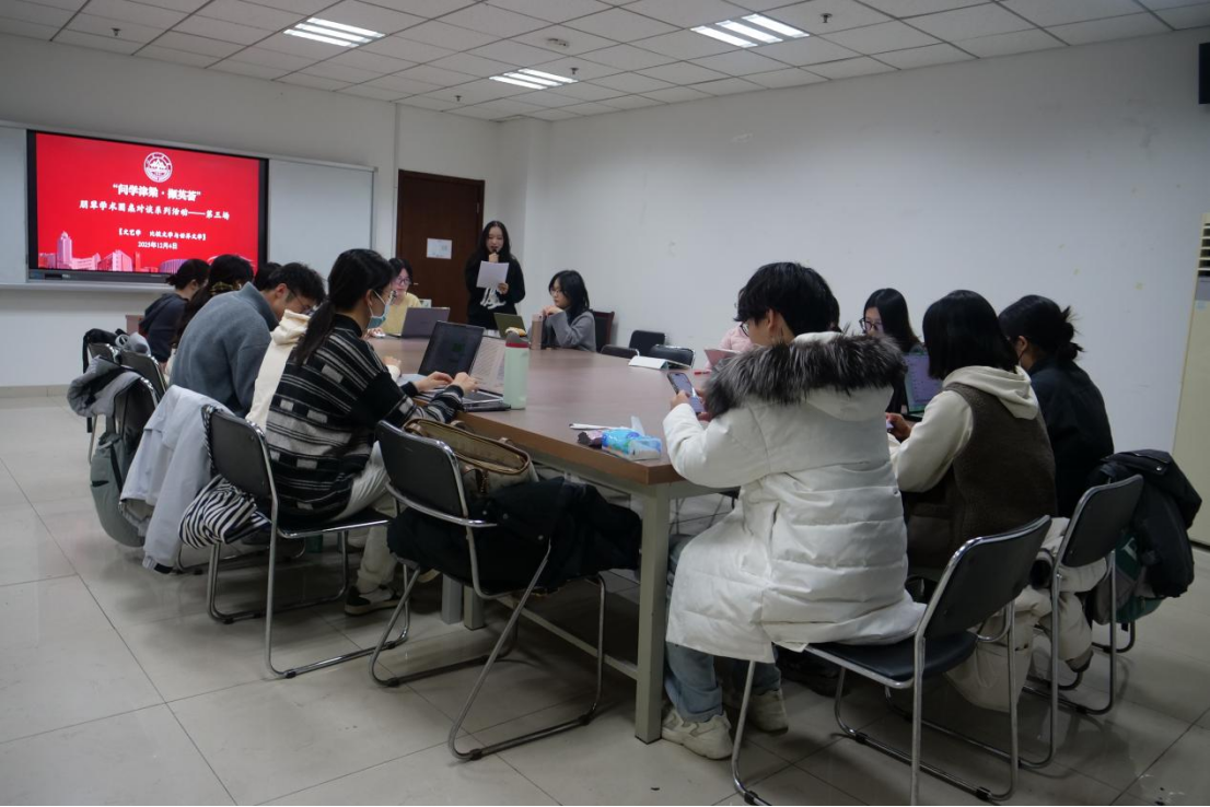 12月4日晚,文学院于知新楼A716举办第三场“问学津梁·撷英荟”朋辈学术圆桌对谈活动。本次活动邀请比较文学与世界文学专业硕士徐怡博、文艺学专业硕士孙雅欣担任主讲嘉宾,学术部干事岳婉婷主持活动。
