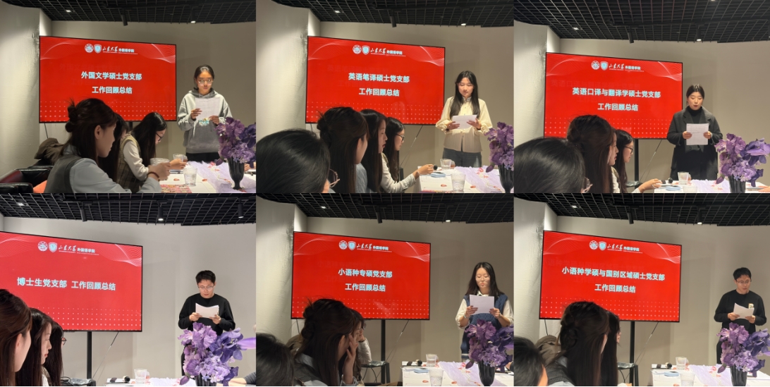 接着,外国语言学及应用语言学硕士党支部与外国文学硕士党支部代表韩唯佳、英语笔译硕士党支部支委商潇月、英语口译硕士党支部副书记张瑞鑫、小语种专硕党支部支委岳晏旭、小语种学硕与国别区域硕士党支部书记王景民,分别就今年各支部工作进行了总结汇报。他们详细介绍了各支部日常工作的完成情况,以及一年来举办的各类丰富多彩的活动,如学术讲座、红色研学以及各类联学共建活动。多个支部代表还表示,希望在新的一年里,持续深化“一支部一品牌”建设,进一步加强各支部之间的沟通与合作,提升支部的凝聚力和战斗力,充分发挥党员的先锋模范作用。