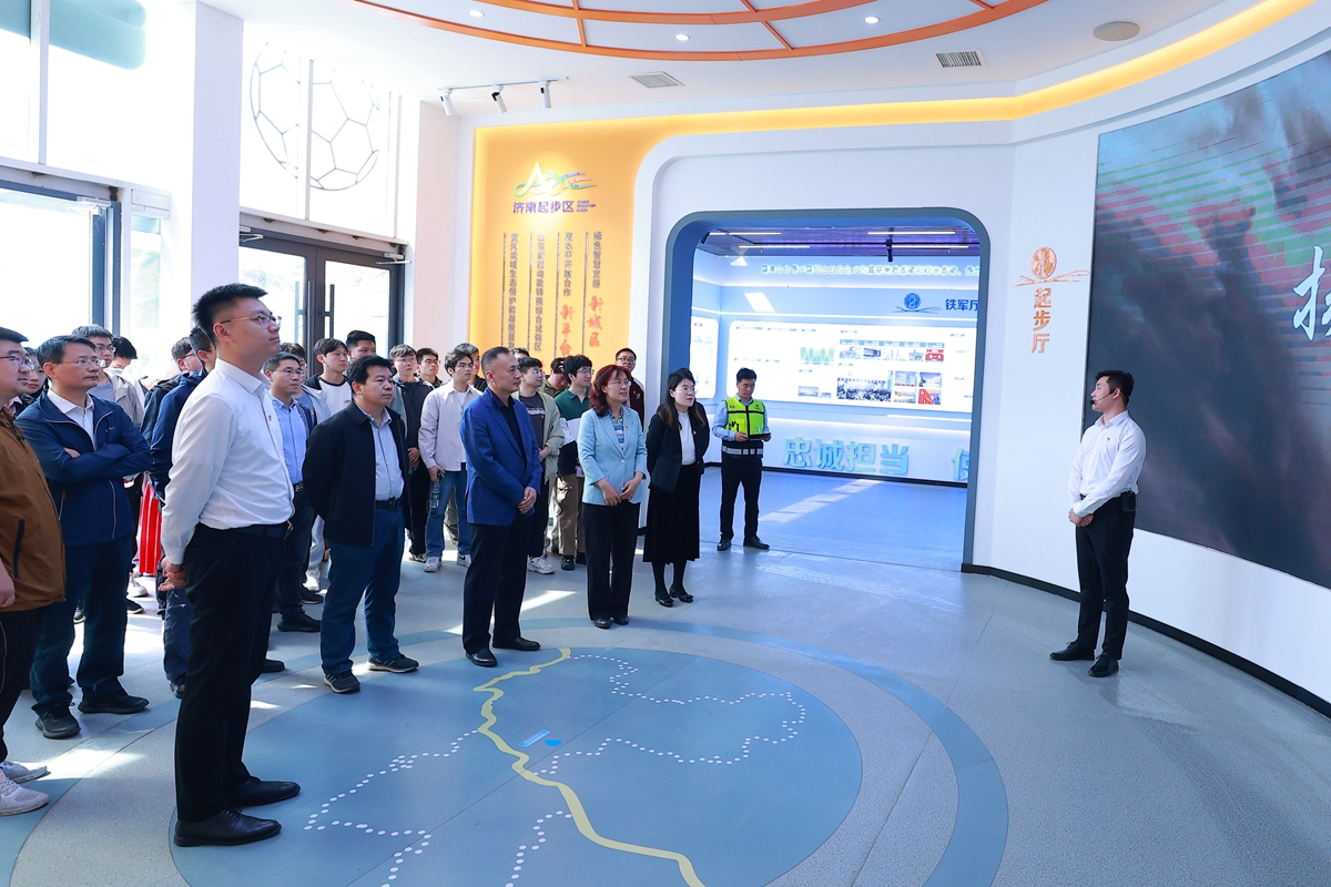 探访筚路蓝缕,感悟红色匠心。活动首站,学院一行在中建八一黄河体育场项目讲解员的引导下参观了企业展览馆。展览馆以“铁军精神·时代担当”为主线,以“国际化、科技化、绿色化”为方向,通过历史影像、沙盘模型及实物展品,展现了中建八一的历史沿革与目前在济南起步区重点建设项目。支部成员深刻感受到中建八局一公司“军魂匠心、家国情怀”的红色基因,以及“智造未来”的前瞻视野。