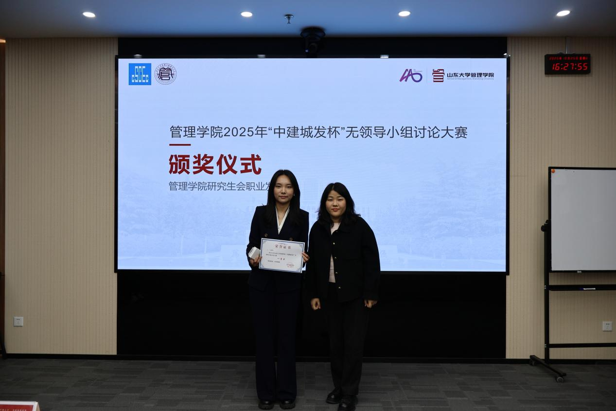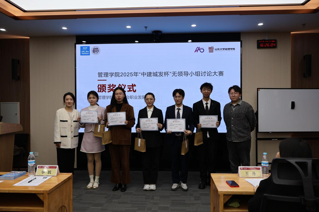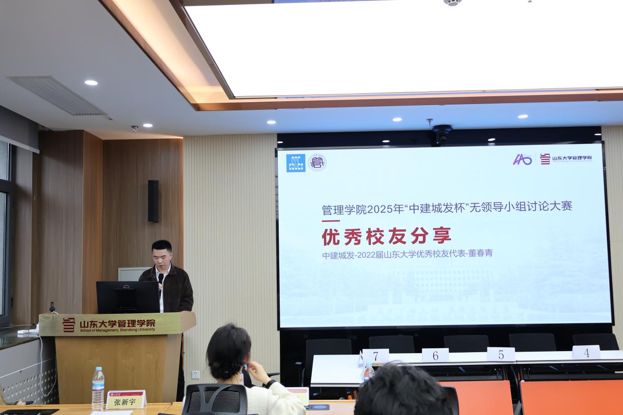 赛后,山东大学2022届优秀校友、中建城发地产开发公司董春青进行了就业经验分享,他结合自身工作经历为在场同学提供了求职的实用建议,帮助学弟学妹们搭建起“校园——职场”的衔接桥梁。经过评委综合评定,大赛最终决出一等奖1名、二等奖3名、三等奖5名,评委为获奖选手授予奖品、证书并合影留念。