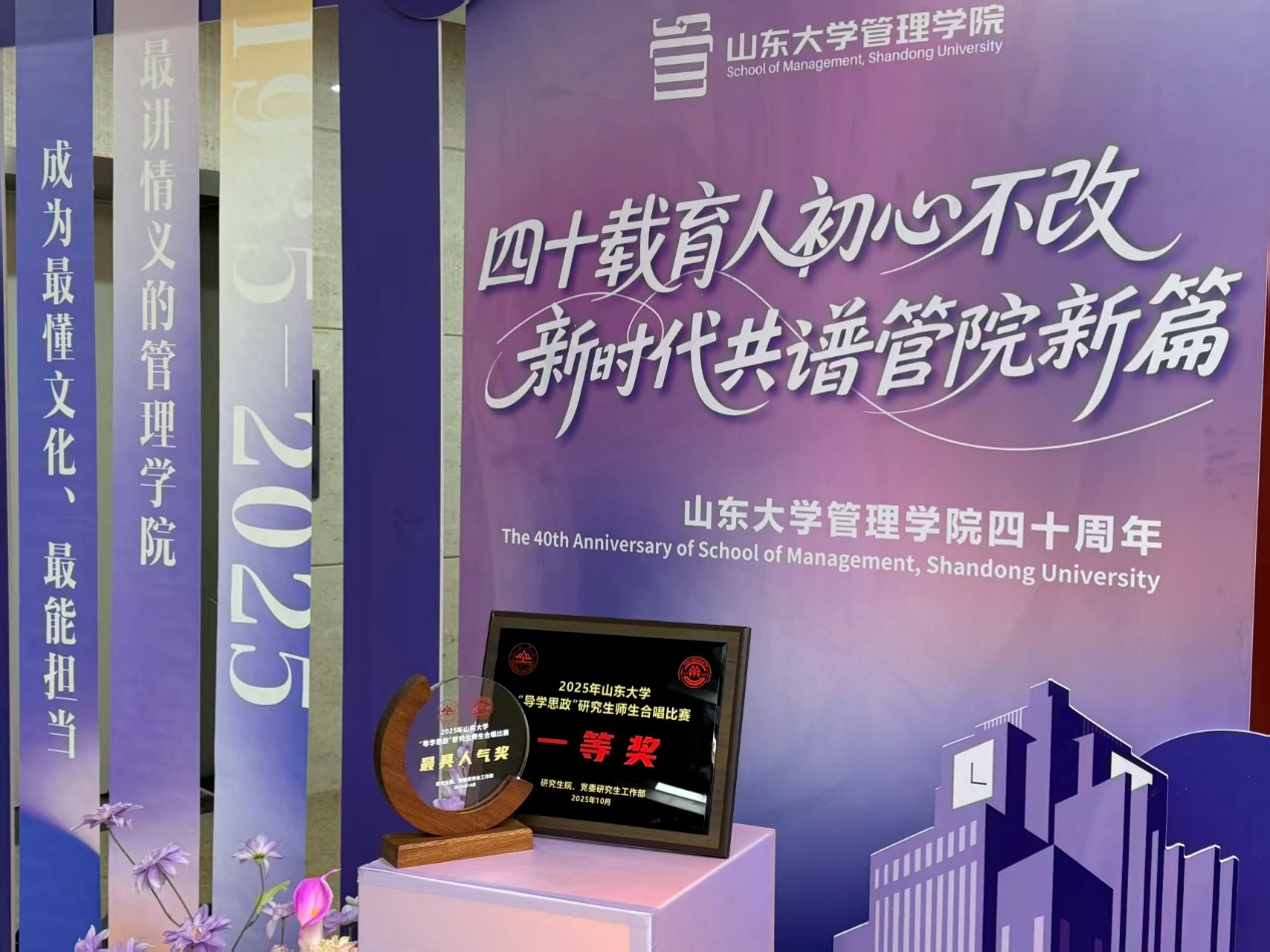 10月26日下午,山东大学2025年“导学思政”研究生师生合唱比赛在中心校区音乐厅盛大举行。比赛中,管理学院以一曲《想你的365天》在29支参赛队伍中脱颖而出,荣获一等奖和最具人气奖。
