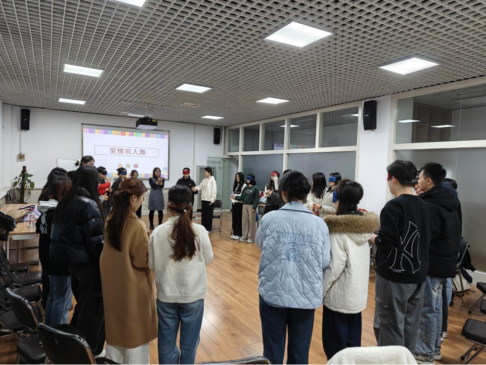 “爱情双人舞”环节中,同学们两人一组,一人佩戴眼罩,由另一人引导完成指定移动任务。这种非语言协作,既考验了双方配合的默契程度,也让参与者领会到信任的重要性。