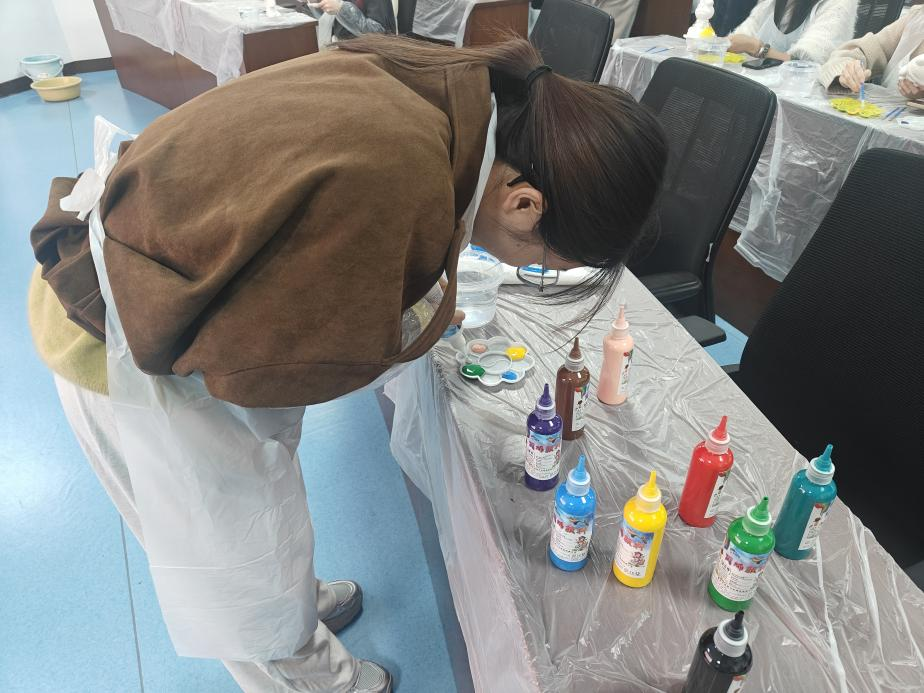 活动筹备阶段,工作人员提前备好绘制所需的石膏坯及颜料,并提供渐变色晕染、细节勾线、颜料补充等方法指导。同时,在操作台铺置保护膜,为同学们配备围裙及手套,做好设施使用及卫生保障工作,为活动开展创造良好环境。