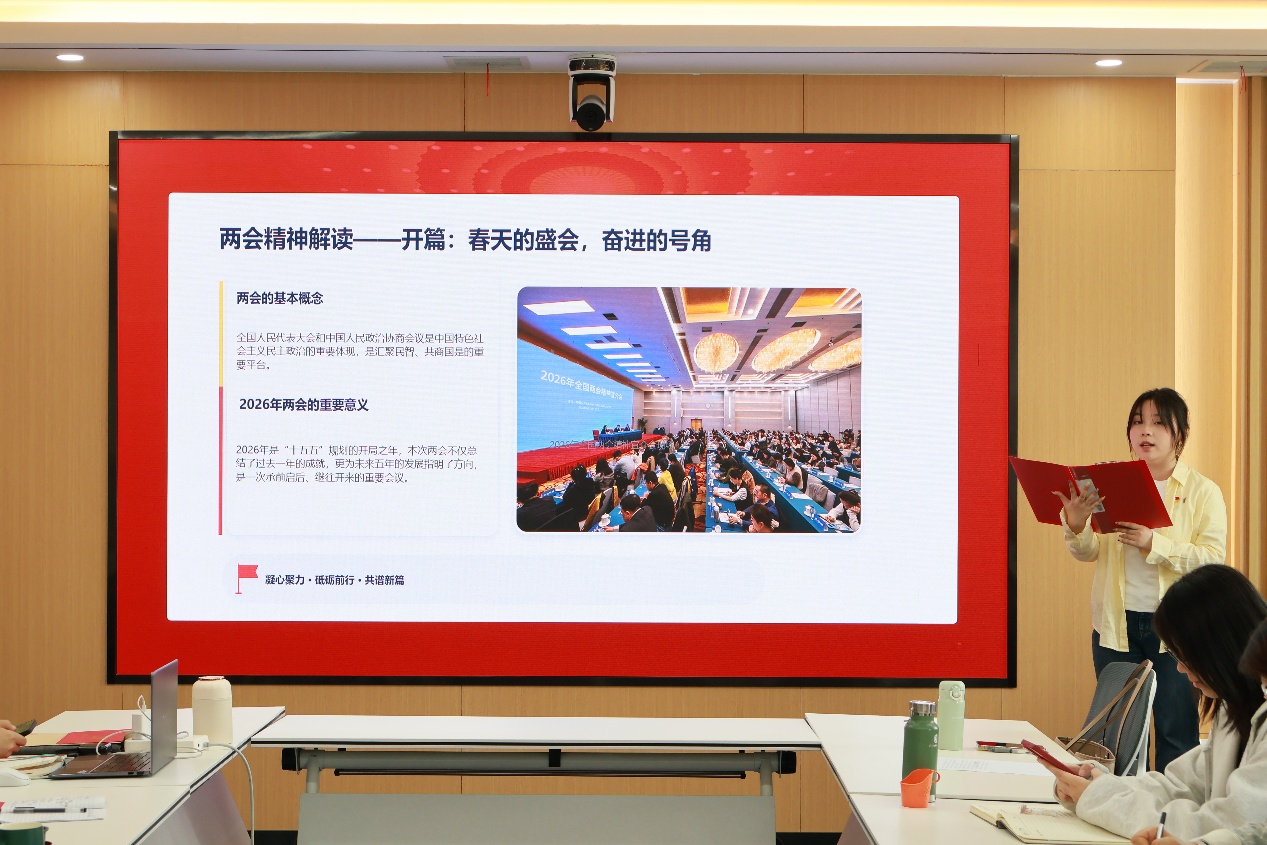 随后,硕士生第九党支部书记朱蜜儿领学两会精神要点,全体成员共同观看两会精神学习视频。