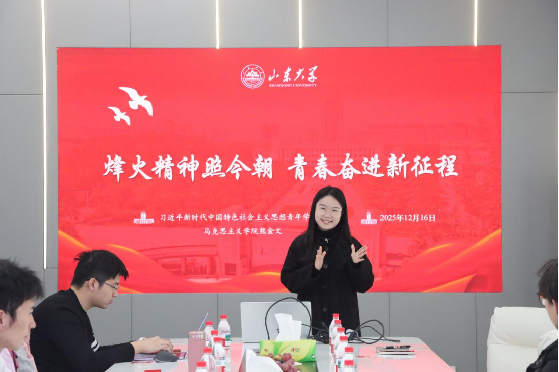 在“信仰接力”环节,马克思主义学院2025级硕士研究生熊金文作了题为《烽火精神照今朝,青春奋进新征程》的主题分享。她以“大峰山的一盏豆油灯”为引,讲述了魏金三等革命先辈在地窖中建立长清第一届县委的动人故事,阐释了抗战精神中“天下兴亡、匹夫有责”的担当与“百折不挠、坚忍不拔”的信念。结合当前国际形势,她还从学科视角深刻剖析了“思想殖民”与“认知战”的隐蔽危害,指出抗战精神是应对技术封锁与外部压力、筑牢国家安全精神防线的重要力量。