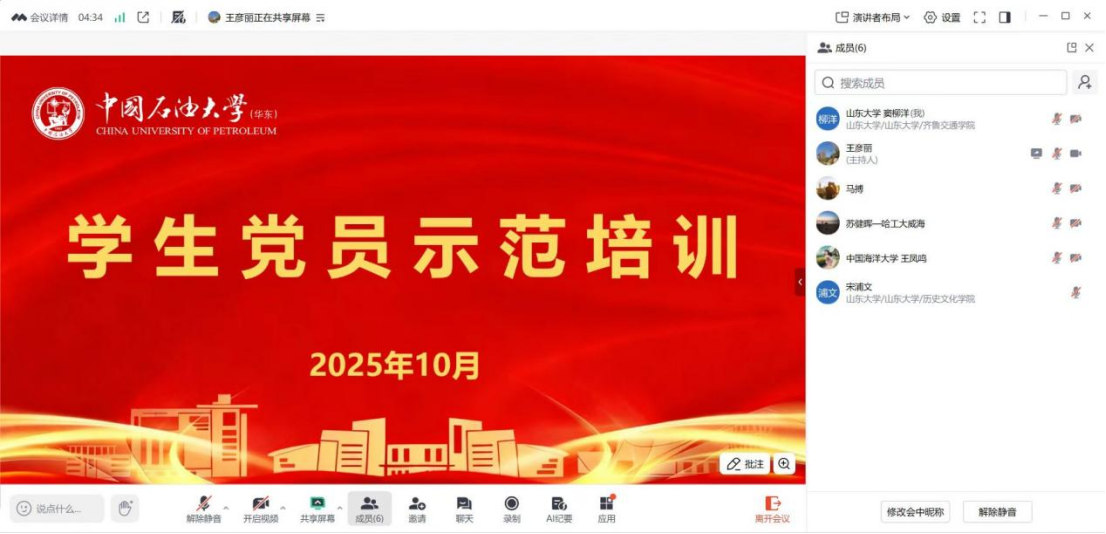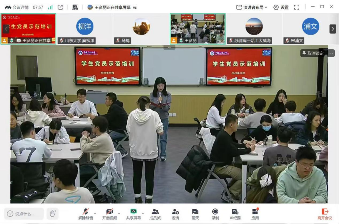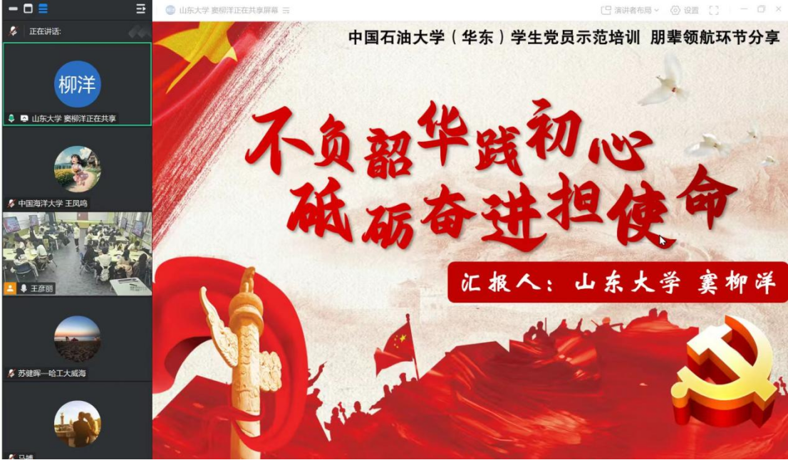 近日,中国石油大学(华东)党委组织部举办学生党员示范培训“朋辈领航”专题分享活动,来自山东大学、中国石油大学(华东)、中国海洋大学以及哈尔滨工业大学(威海)的优秀党员代表齐聚云端,围绕党建工作创新实践与样板支部建设路径开展深入交流。山东大学齐鲁交通学院硕士岩土第一党支部书记窦柳洋受邀作专题分享,介绍支部党建创新经验与育人成效。